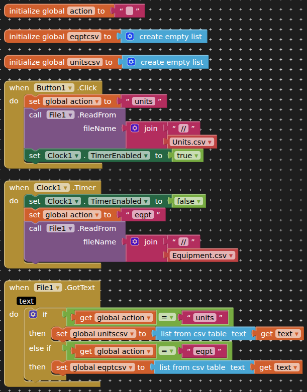 Additionally, I've currently disabled just about everything that isn't relevant to this specific bug hunt on the screen of the .aia project where I'm asking for help, which should help expedite familiarity for anyone looking at it for me. Units.csv (1.1 KB) Equipment.csv (791 Bytes)