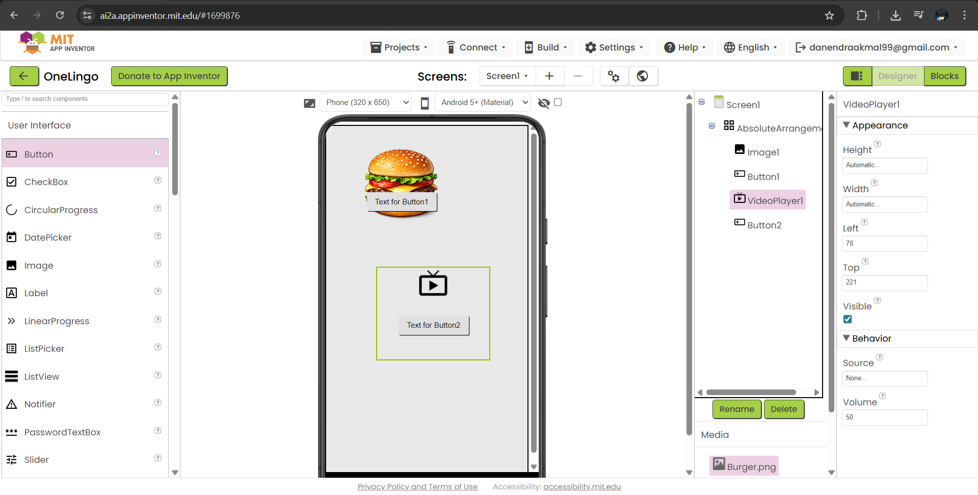 If you want to overlay the burger image with the button, then use two vertical arrangements, one inside the other, placing the image as the background to the "outer" vertical arrangement, set the background of the inner vertical arrangement to "none". I used a blank label to offset the the button vertically from centre.