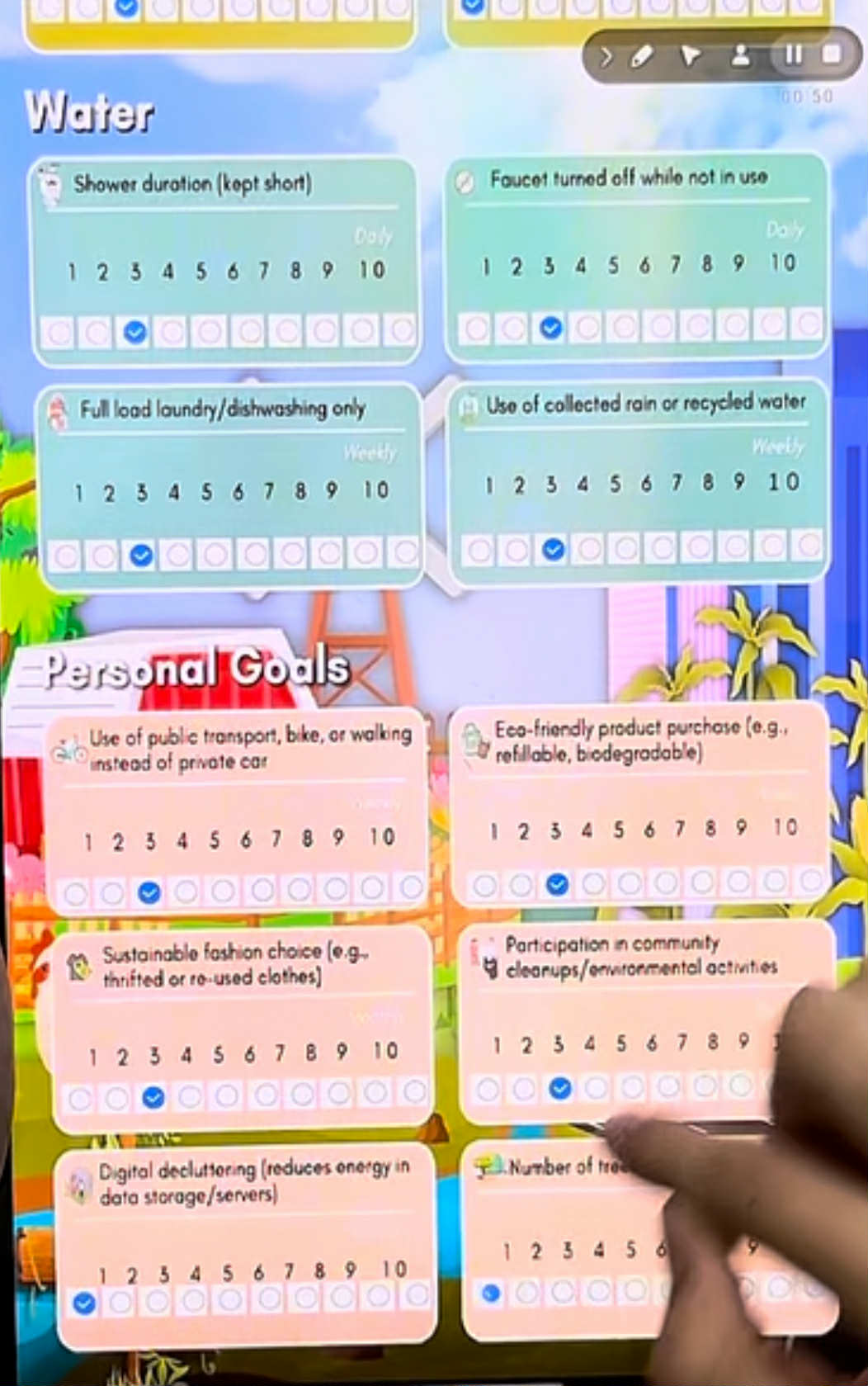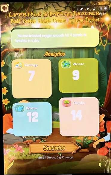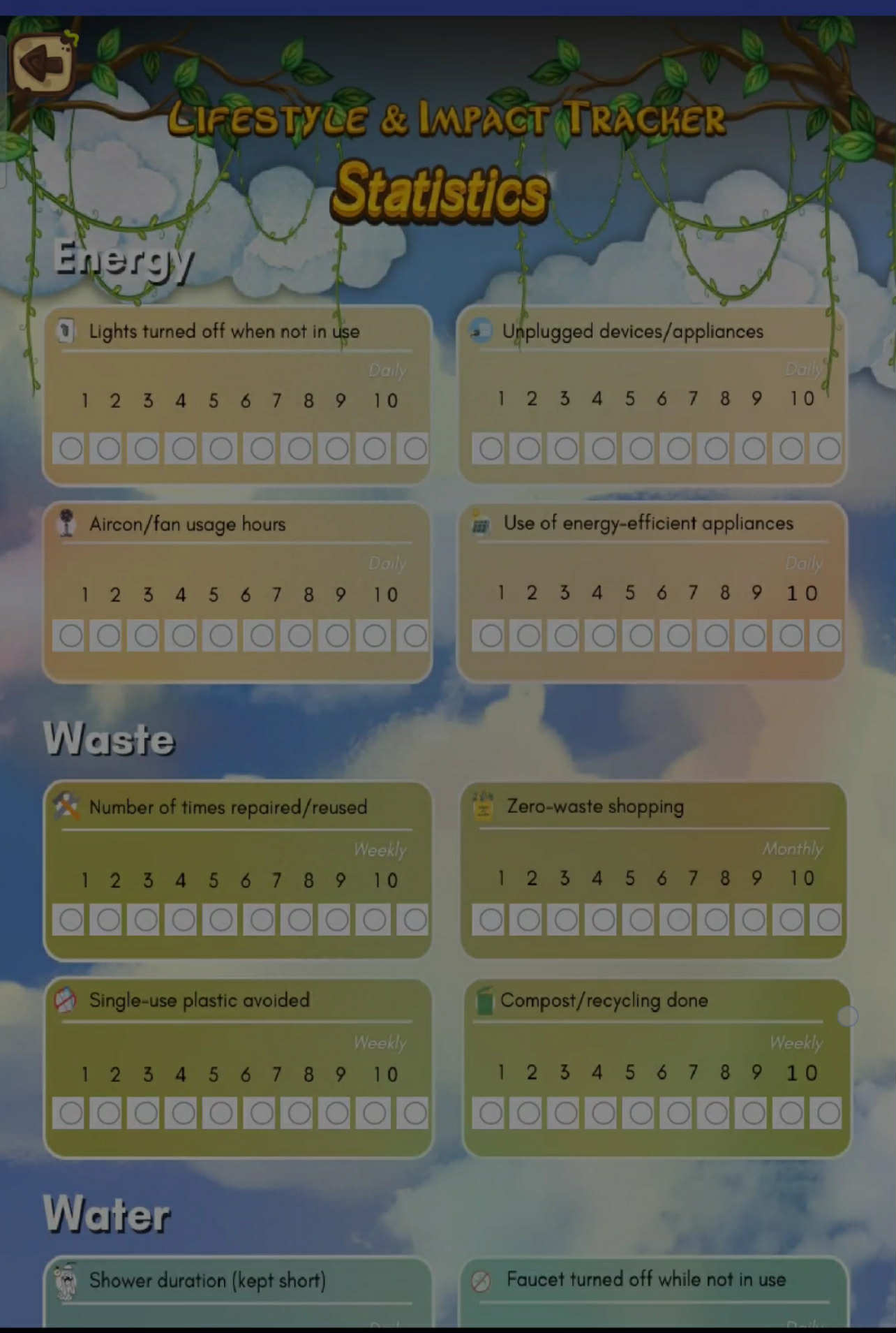 I want it to work like in the images, where each category (Energy, Waste, Water, and Personal Goals) has rating circles from 1 to 10. When I press a circle, it should automatically add up the points and show the total in the Analytics section (for example: Energy – 7, Waste – 9, Water – 12, Goals – 14).