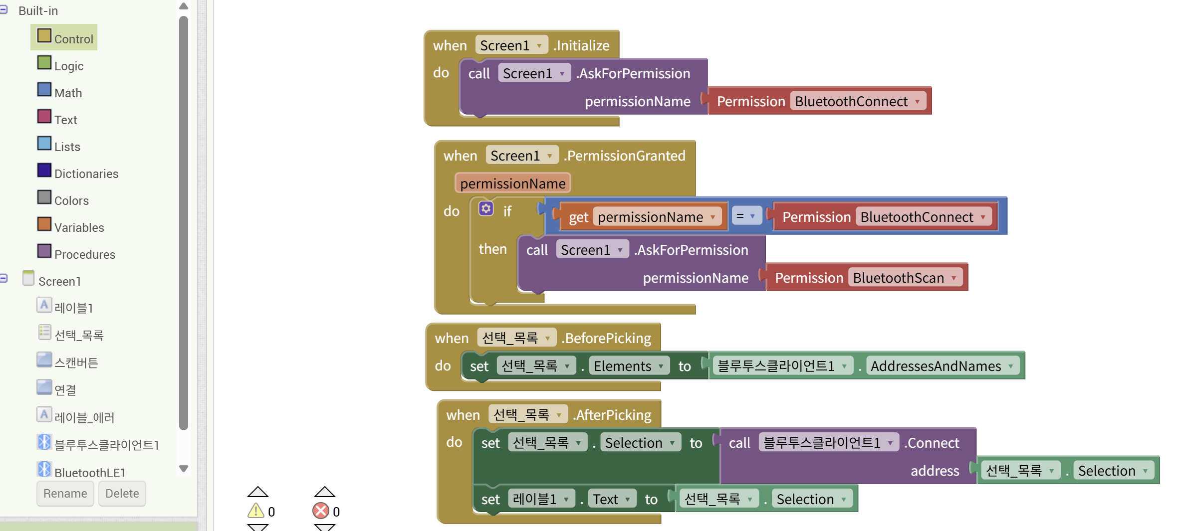 앱인벤터 소스를 보는바와 같이 앱인벤터와 마이크로비트를 블루투스로 연결하려고 합니다. 화면에 블루투스 선택목록에서 마이크로비트를 확인할수 있습니다. 선택을 하려고 했더니 선택이 안됩니다. call bluetoothClient.connect address 에서selection이 안되는것 같습니다. 도대체 무슨 문제일까요? 몇일동안 밤을 새워 생각해도 해결할 수 없습니다. 제발 도와주세요.. 답변주시는 분들에게 미리 감사인사 드립니다.