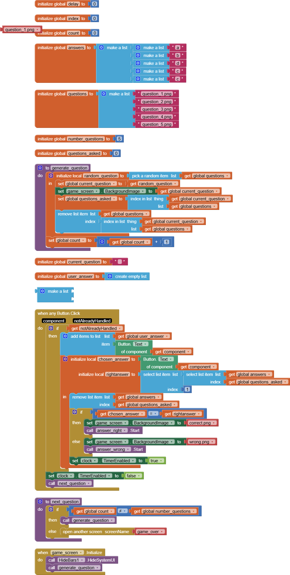 You seem to want to have a delay after processing your answer button clicks, to let your response sink in. You are starting and stopping a Clock (dangerously named Clock instead of Clock1 or ClockAnswerDelay, begging for AI2 to mis-interpret the name as the Generic component name "Clock".)