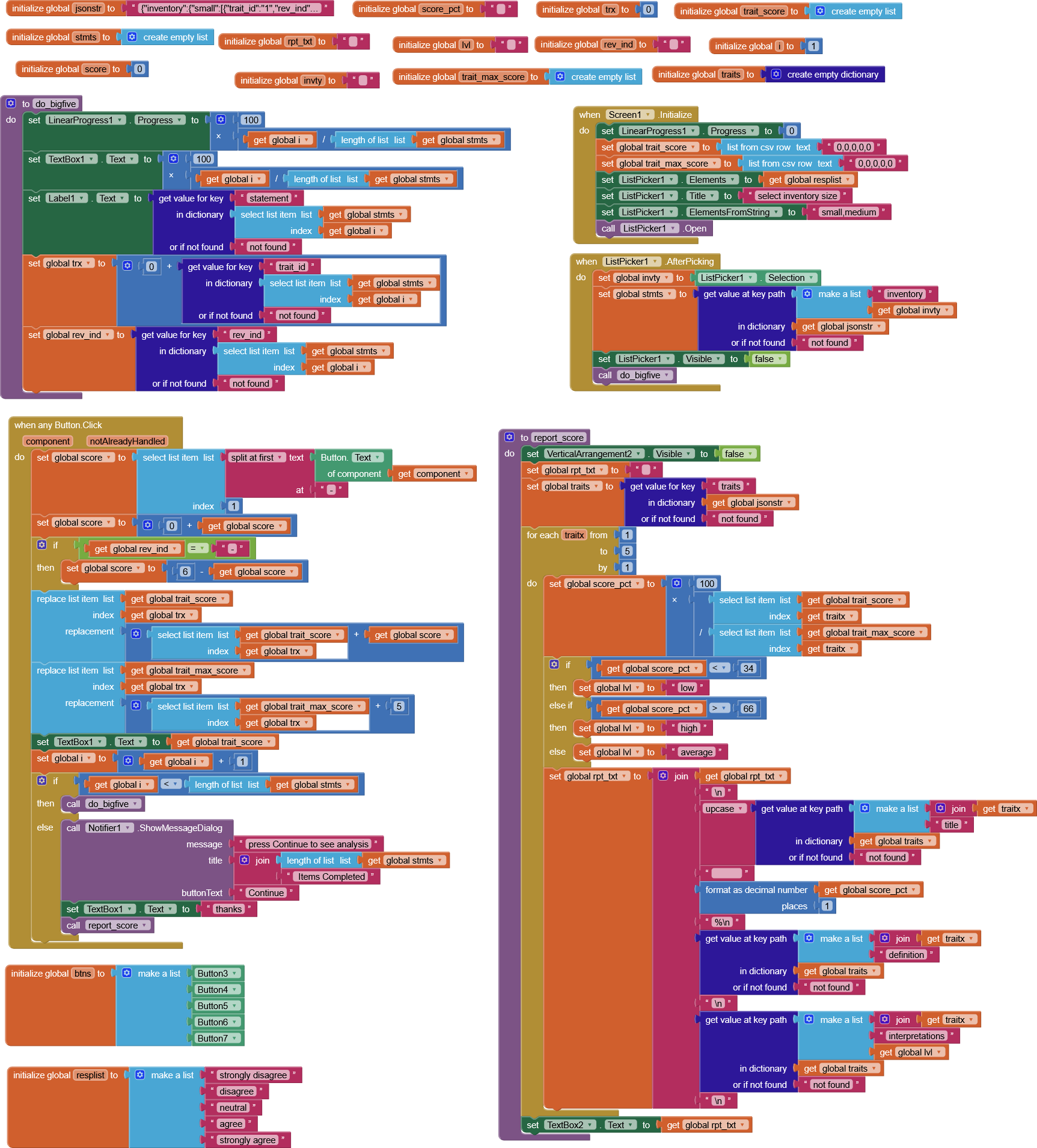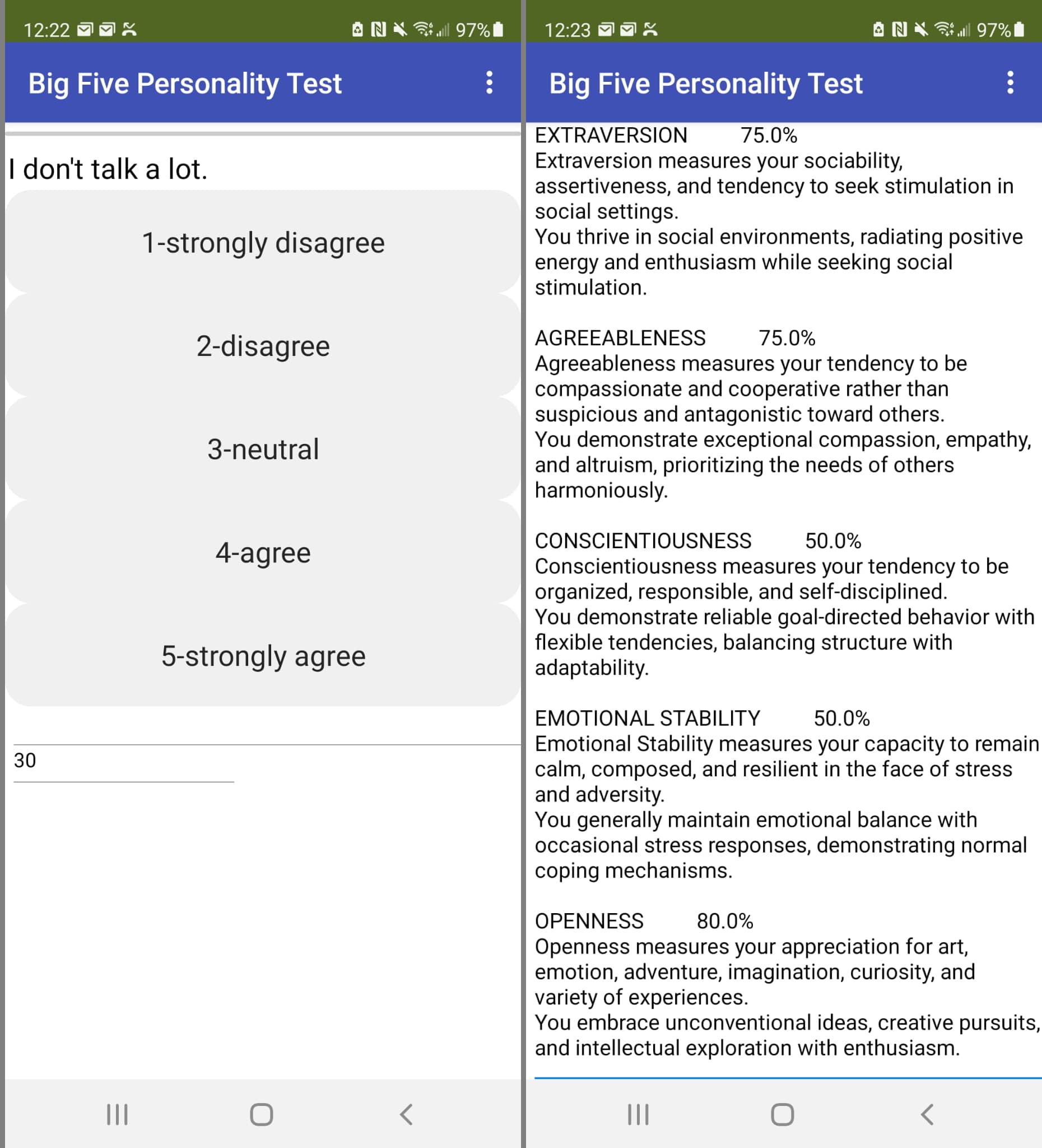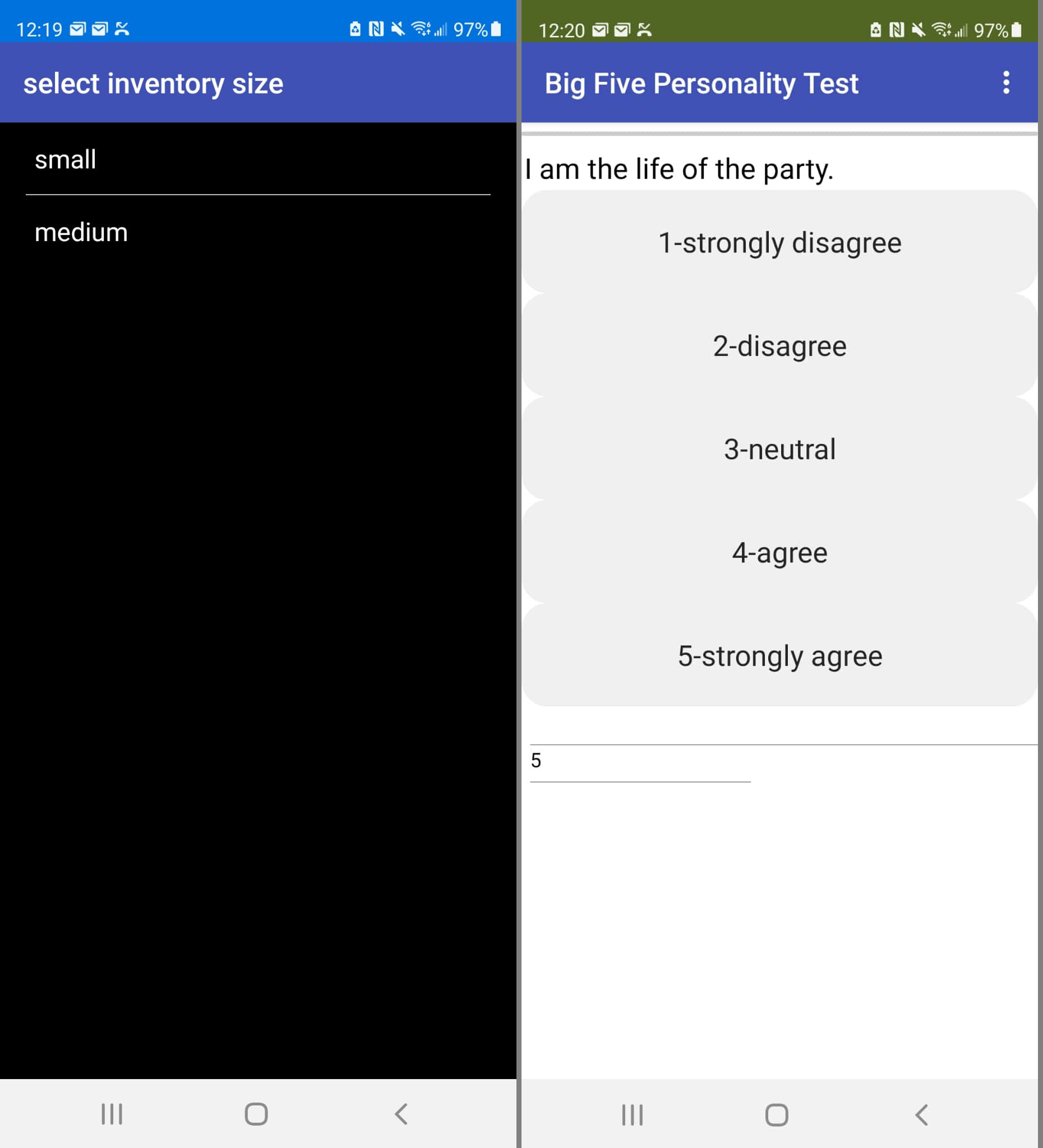 as soon as you start, you are given a choice of which inventory size do you want to play with. after that, you are presented with the first question - statement actually. you reply by pressing the button that best represents your personal feeling about the statement. on a scale of 1 to 5. then it continues with the rest of the statements until they are exhausted.