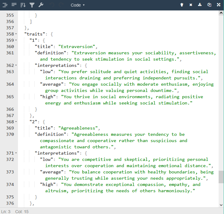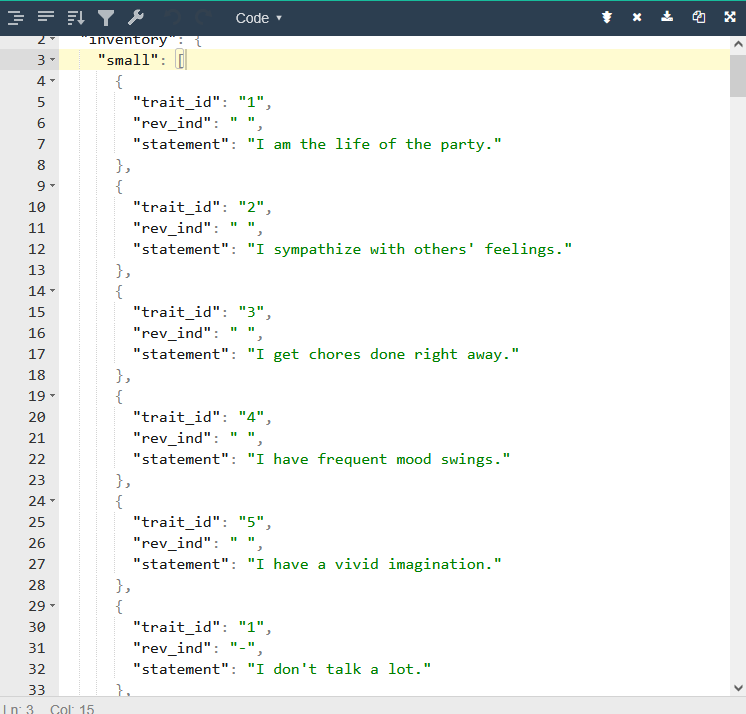 the details of the processing are embedded in elements of the json structure read during initialization. the first part of the json describes the questions/statements as shown by the sample snapshot below