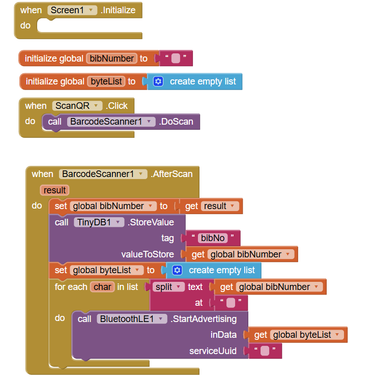 You set global byteList to an empty list, then send it into the Advertising block unchanged, repeatedly according to the length of the bib number. That's a whole lot of nothing being advertised.