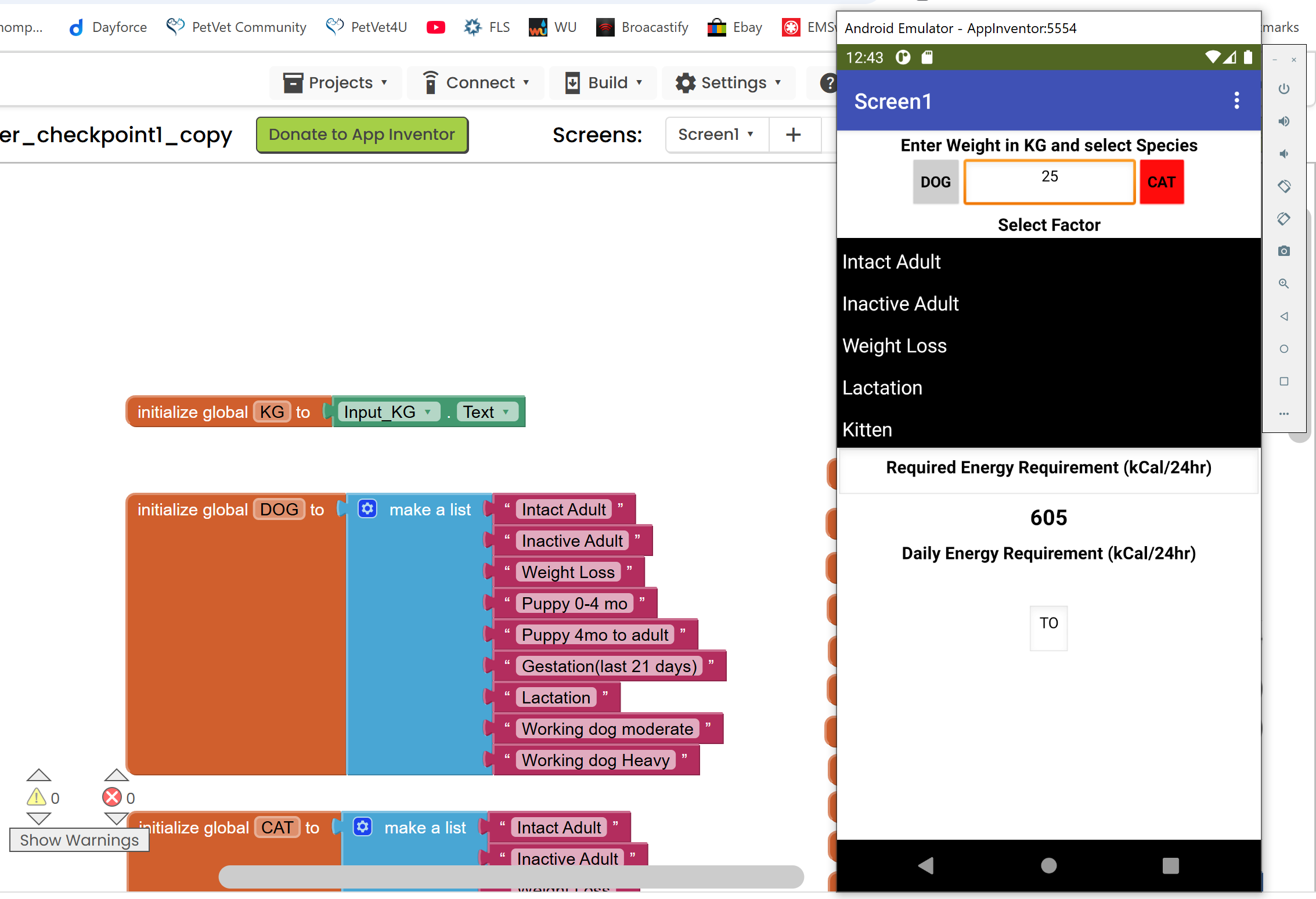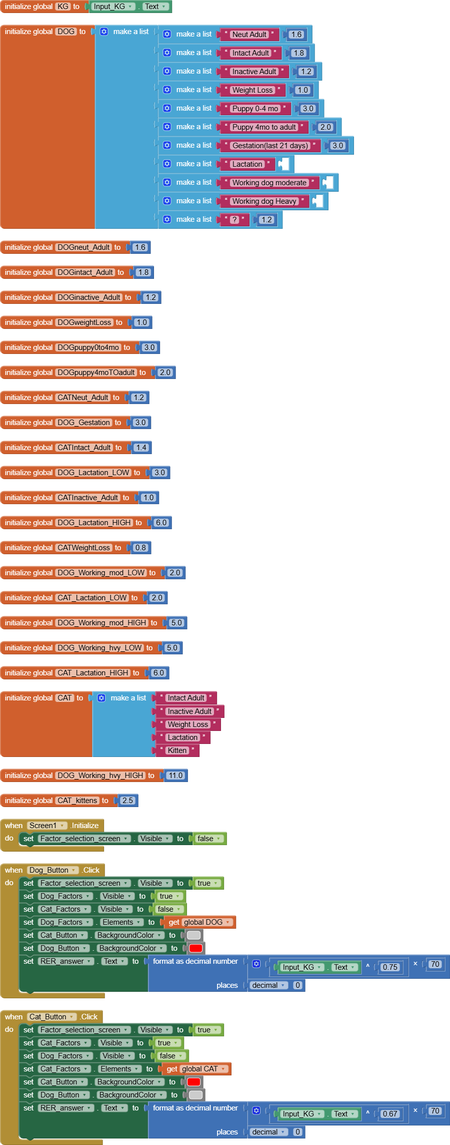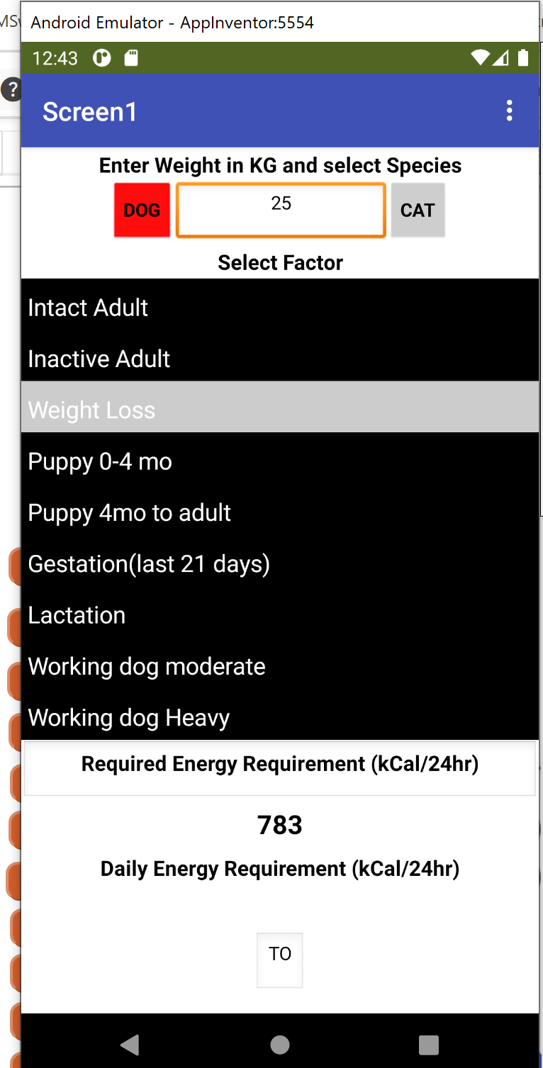 Basically, a (not so) simple calculator where you enter the weight in Kg, select dog/cat.