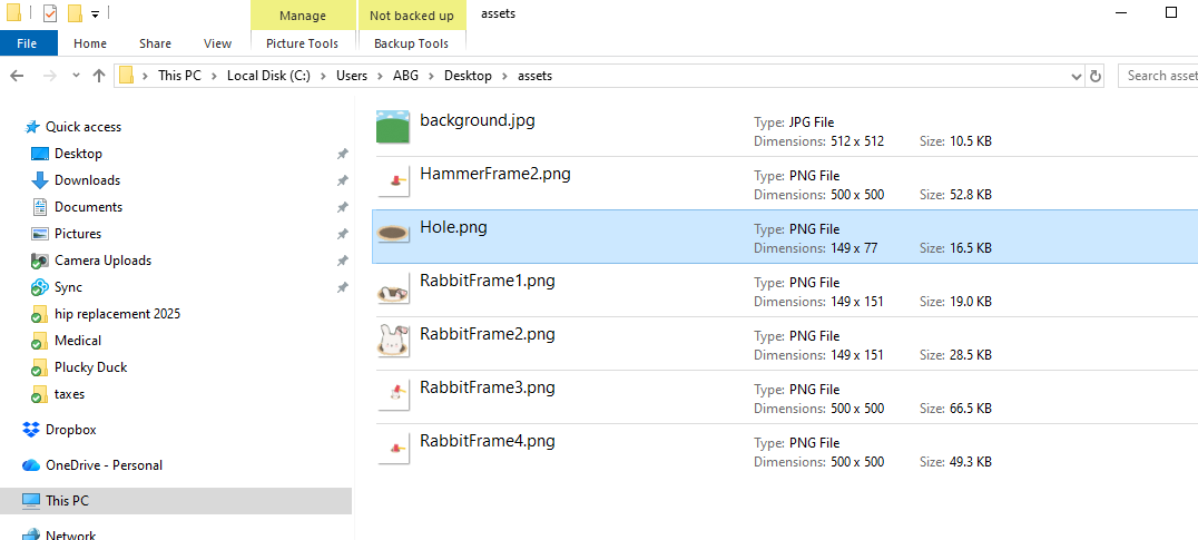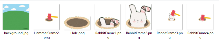 Unfortunately, the picture files are different pixel sizes, so the hammer looks tiny compared to the rabbits and holes.
