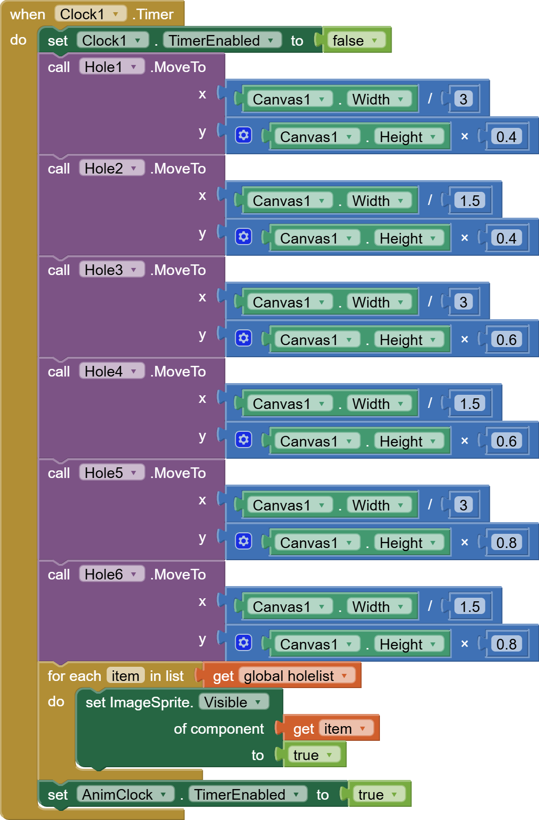 The work in the Clock1 Timer event needs a moment after startup for the Canvas to display and receive its Height and Width values from Screen1. Without that Clock Timer, the Canvas would look distorted.
