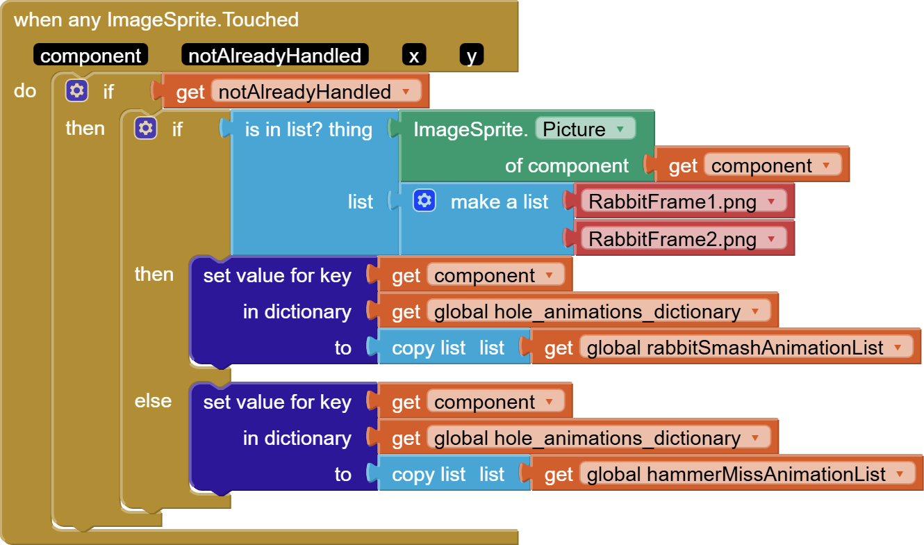 The Picture of the touched hole sprite guides us in how to react. If it one of the two rabbit popup picture files, then we load that Sprite's animation in the animation dictionary from a copy of the animations list of the rabbit being smashed by a hammer.
