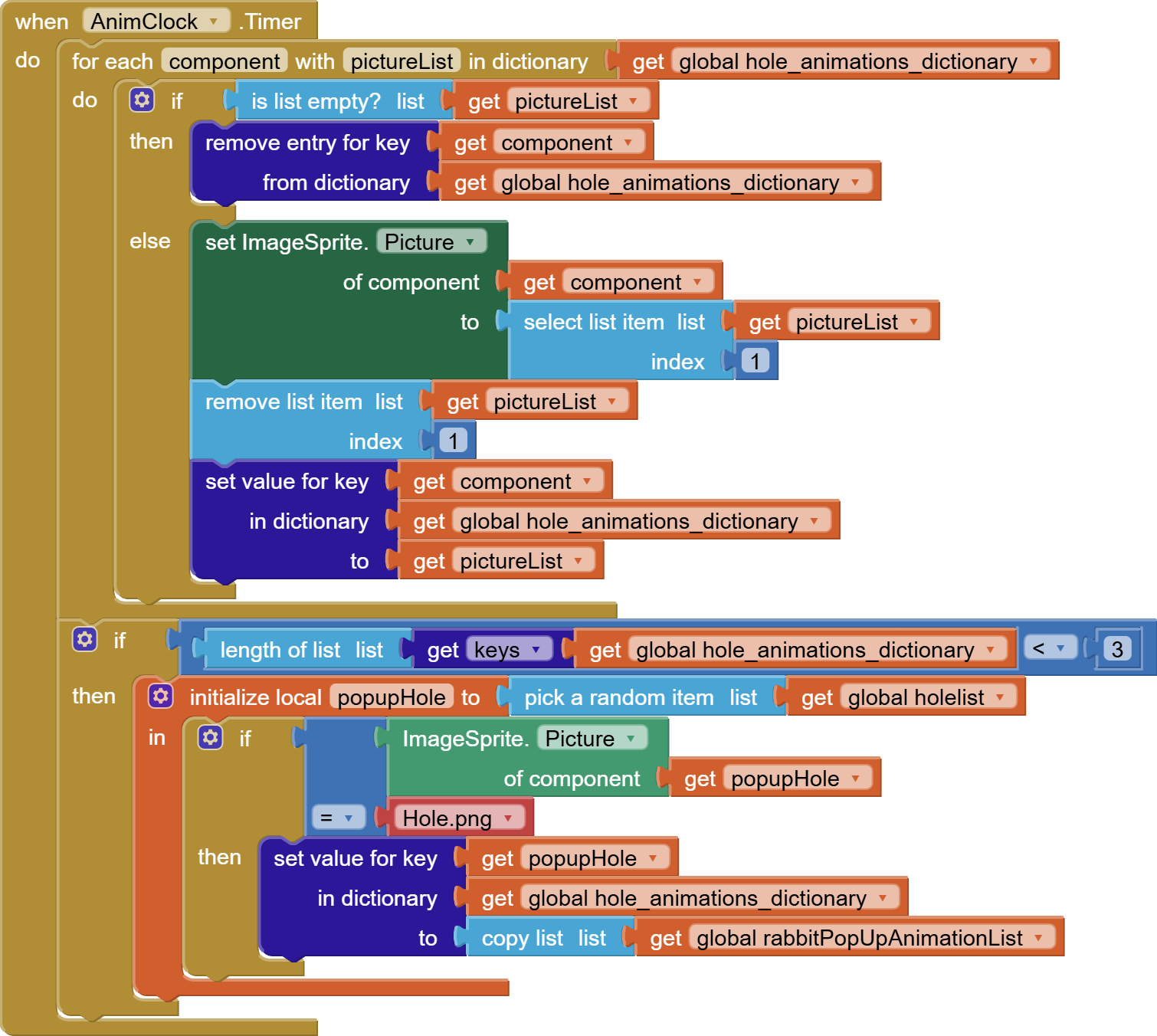 After all the animations have run in the animations dictionary, it's time to replenish our supply of rabbits. The animation dictionary's list of keys gets shorter and shorter as each animated sprite runs out of animations and gets removed from the dictionary. So we use the count (length of list of the dictionary keys) as our cue to pick a hole and get it started with a rabbit popup.