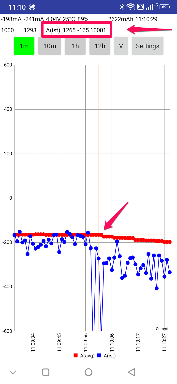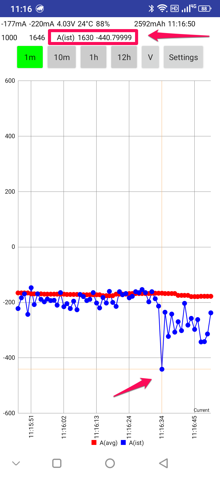 In my case ( on my phone ) the average and istantaneous currents are both in the same scale and shown correctly.on the graph