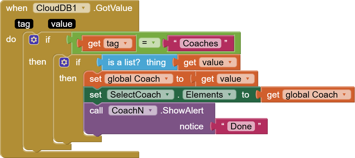 apparently it still doesnt work.. i even added a button that clear the values in the cloudDB.. but the "add coach" still does nothing. It does trigger the "Done" alert from notifier but it doesnt change the list