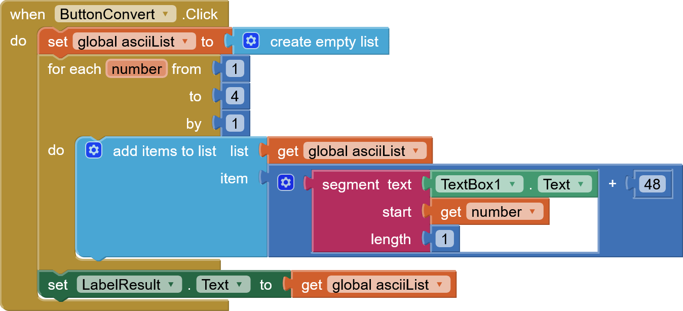 I try to explain my code. First I read 4 digits number from the text box. Next I divide this text to single char and convert each single char to number. At the end number is converted to ASCII number. I used a lot of "if instruction" to make it.