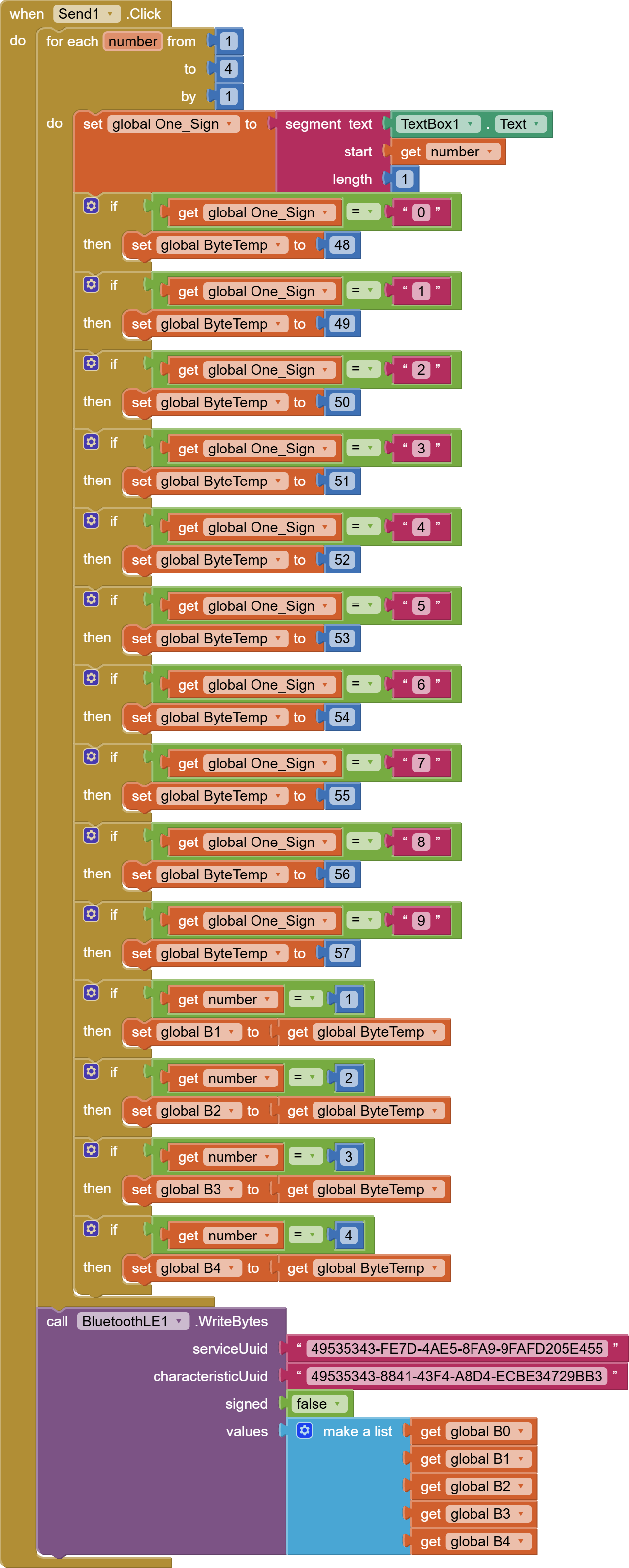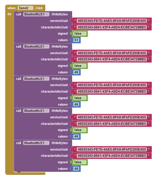 For example, I want to send the number 31111. To do it, I convert each single digit to its corresponding ASCII value (3 is 51 and 1 is 49) and send it byte by byte. I did this only for test, because this method is not very optimal, but it proved that my device can read data from the app. Below the picture to better understand what I did.