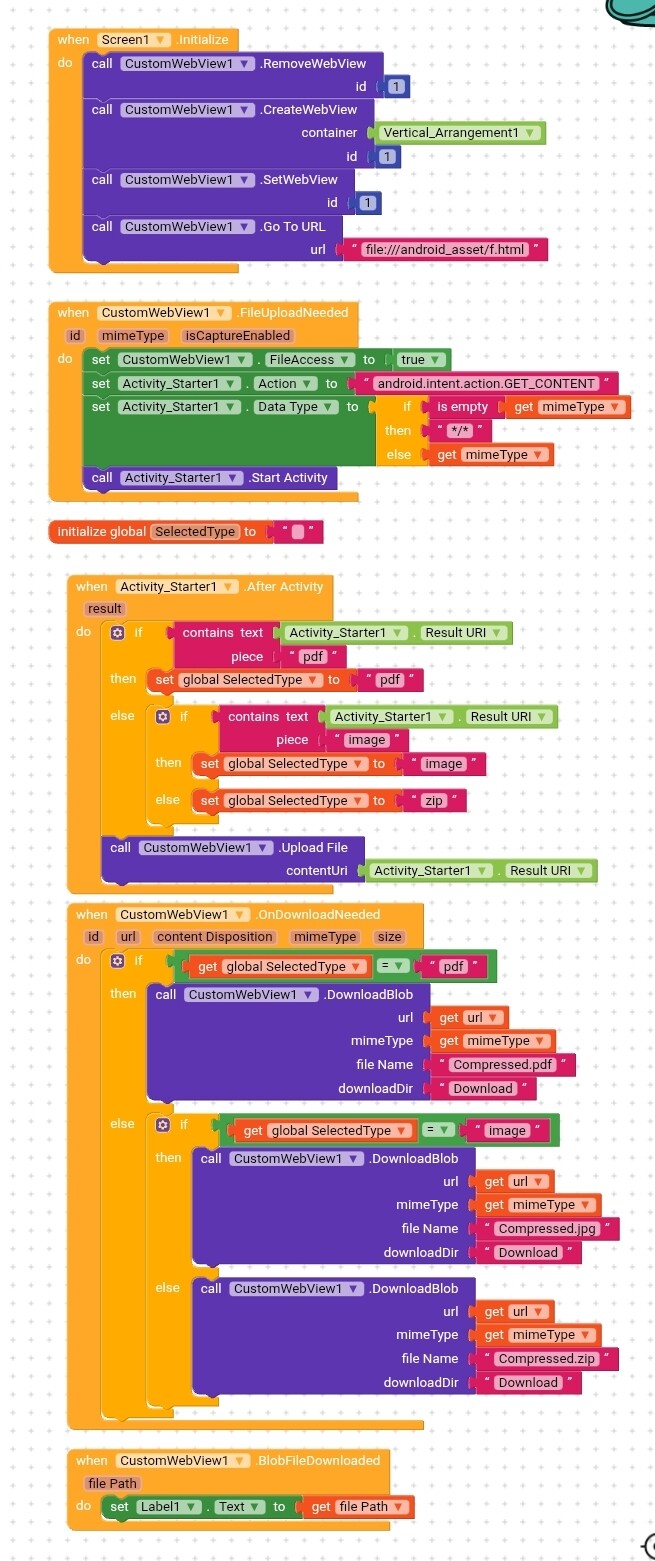 String Limit: Since this is a File Compressor app, the Base64 strings might be quite large (e.g., 5MB to 10MB). Have you tested if window.AppInventor.setWebViewString has a character limit or if it causes the app to freeze with large data?