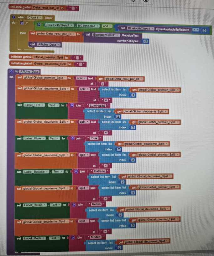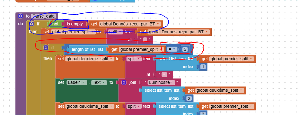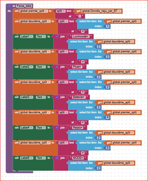 In other words, the variable that contains the whole string (received from BT) shall be displayed without any modification into a label. In that way you can be sure that the communication works fine. If not, you shall investigate in those boundaries before applying the splitting procedure.