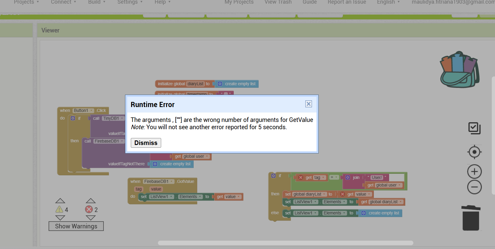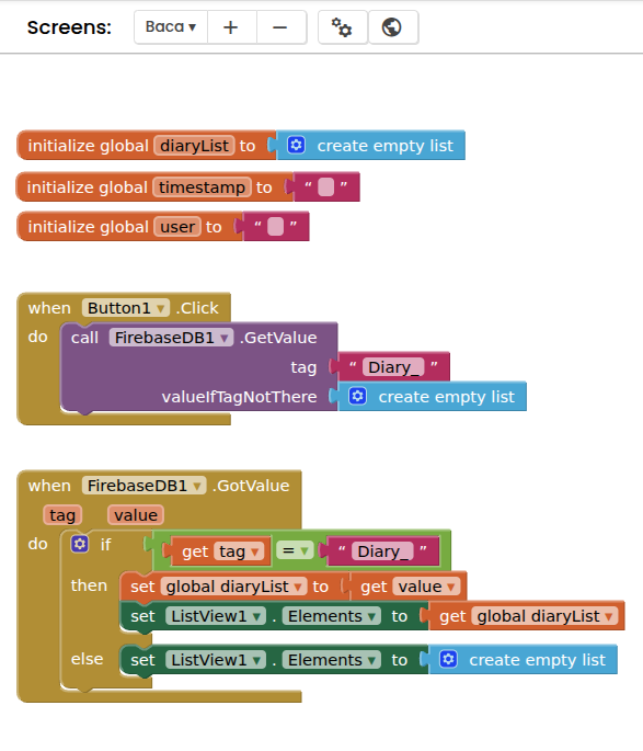oh right, my bad. for returning the user's diary, it's tinydb get value right? the block can't be put on under the call firebase so i use if block.