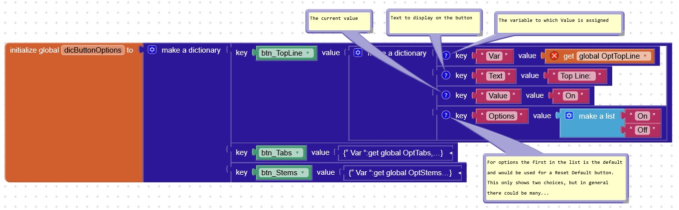 I'm developing an app which requires multiple parameters to be set with button options and textbox values. To avoid many almost identical button.click routines i am using the when any Button.Click functionality. The problem is how to assign the selected option to a variable. Attached is a screenshot of a sample dictionary for three buttons. This holds the text for the button and the available options that each click of the button toggles and weel as the selected value. But I need to asign that to a variable. However, I've not found any way to identify the particular variable (see error). If each variable requires its own assignment there seems little point in having a when any Button.Click routine. Any suggestions??