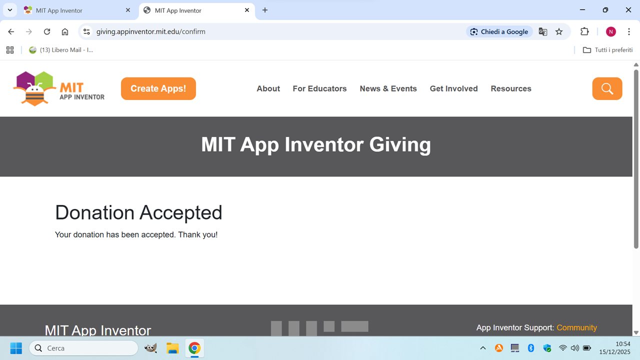 Hello everyone, It's been 8 years since I've enjoyed programming with MIT App Inventor; that's why I wanted to make a donation too. I recommend everyone do so. Best regards Nicola