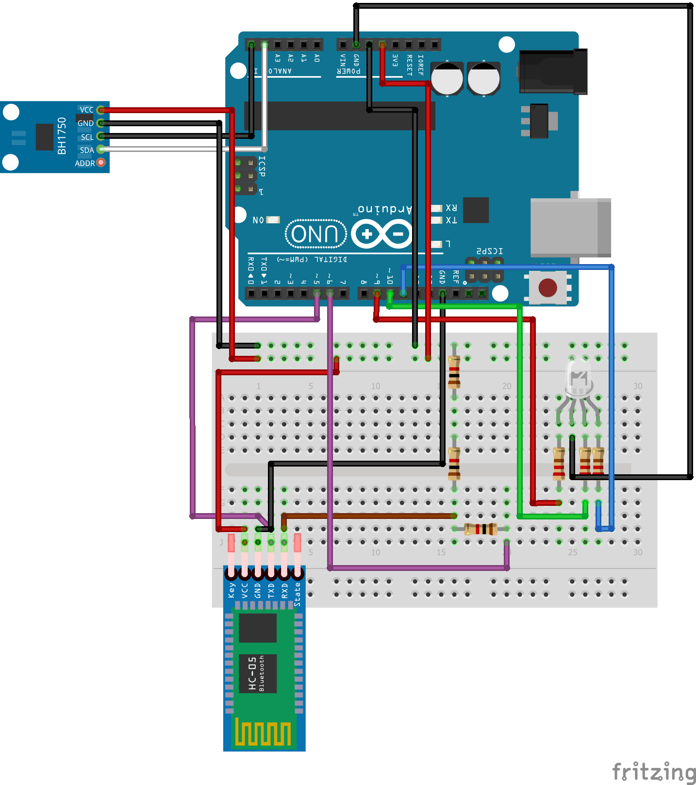 (I made a workaround for the HC-05's RXD because I didn't have a 2K Ohm resistor, using two 1K Ohm resistors instead, if it doesn't matter).