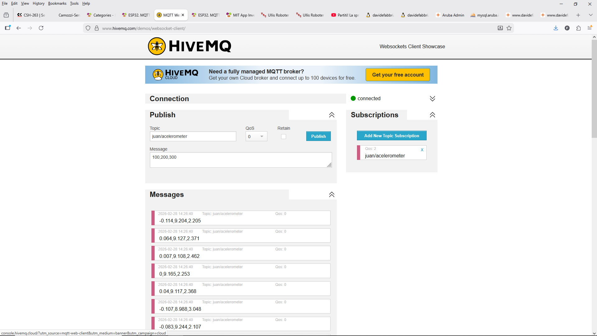 AcceleratorSensor "Publish" in HiveMQ xAccel,yAccel,zAccel with topic: juan/acelerometer