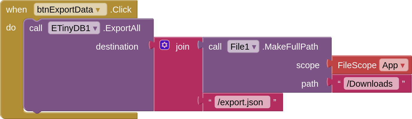 Hi, i'm quite new to App Inventor. I was trying to use the ETinyDB extension to export mi database to a json file on my device. I downloaded the .aix file and imported it to extensions. But whenever i get to the screen in which i wan't to click export data, i get this error.