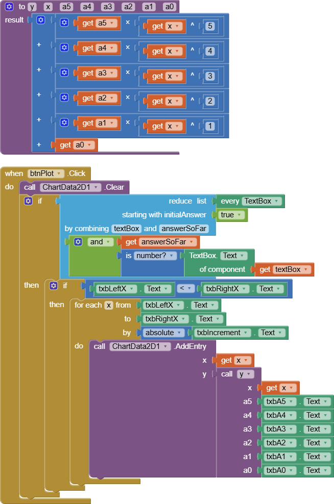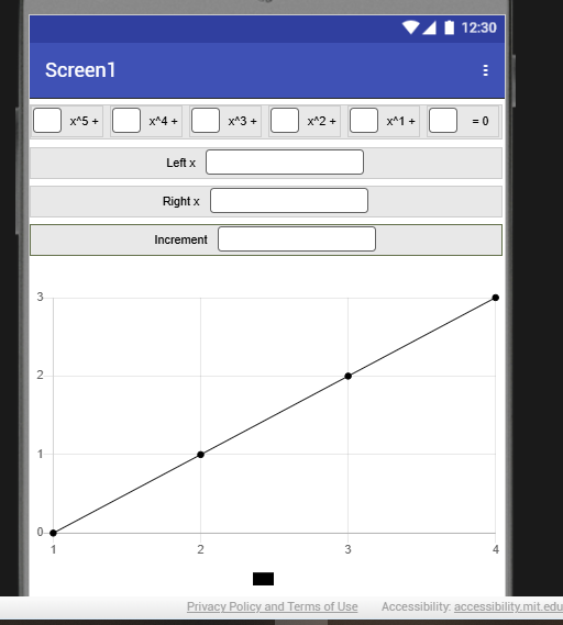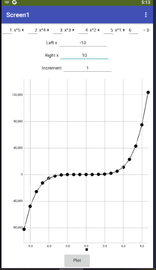 I have a school project relating to MIT App Inventor in which we have to make an app that can solve (approximately) a fifth-degree equation of this formating: α5 x 5 +α4 x 4 +α3x 3 +α2 x 2+α1 x +α0 = 0 . While also allowing the user to enter a value for the deviation margin, allowing the user to enter the two ends of an interval where a solution will be sought, allowing the user to enter the step of changing values from the left end to the right “end”, and finally calculates the value of x using the above method. If no value of x satisfies the deviation criterion, displays the message “No solution found!”.