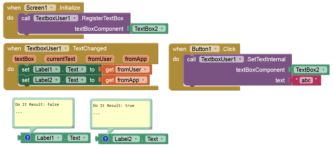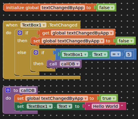This algorithm doesn't always work because when reading from the database, the event only fires when the data in the affected block (text, checkbox, switch, etc.) differs from the values defined in the Designer for that block (text, checkbox, switch, etc.). The TextChangedByApp variable doesn't always need to be set to true. It only needs to be set to true when the data read from the database doesn't match the value of the affected component in the Block Designer. To better detect this topic it must be tested with a Checkbox f.e. or other component not Tetxt