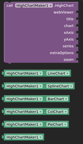 line, spline, bar, column, pie & pie-donut - As you will see from the example blocks and aia, to generate a chart, you will need to provide a set of dictionaries to feed the sockets in the extension.