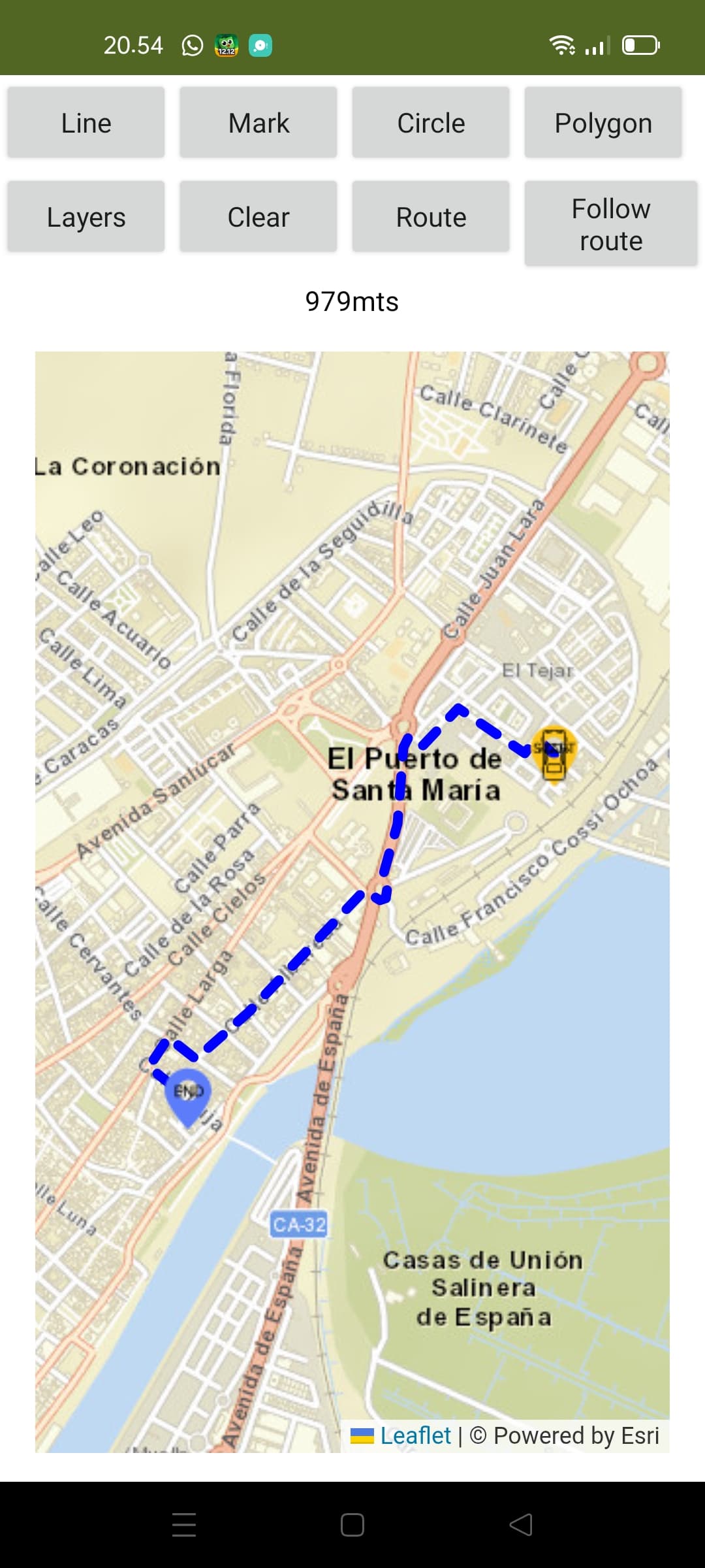 Functions have been included that calculate the length of the line in meters and the areas of the polygon and circle in square meters.