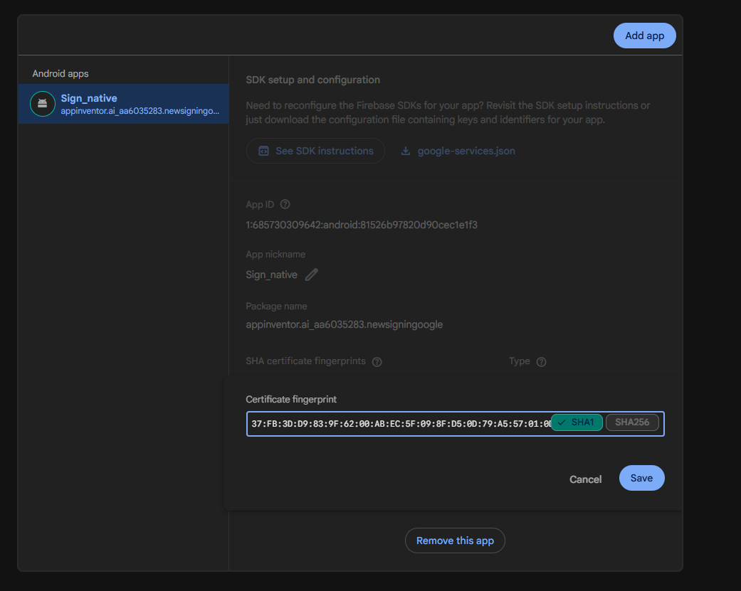 Google needs to know your specific App Inventor app is the one asking for access. It uses a "fingerprint" called SHA-1.