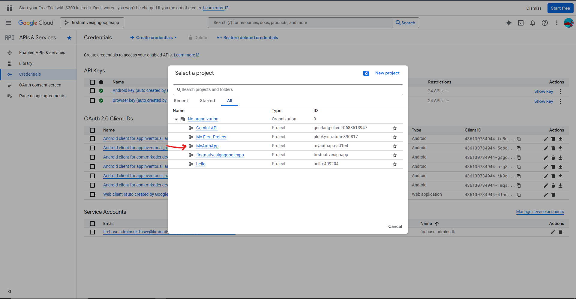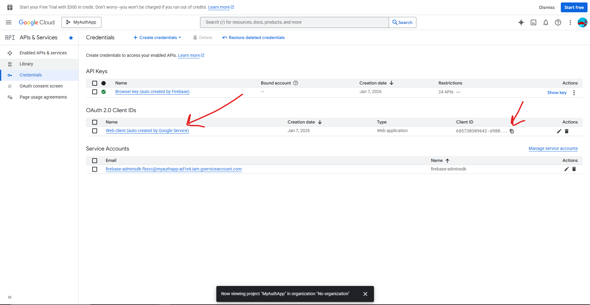 - Go to console.cloud.google.com/apis/credentials (Make sure you select your Firebase project at the top!).