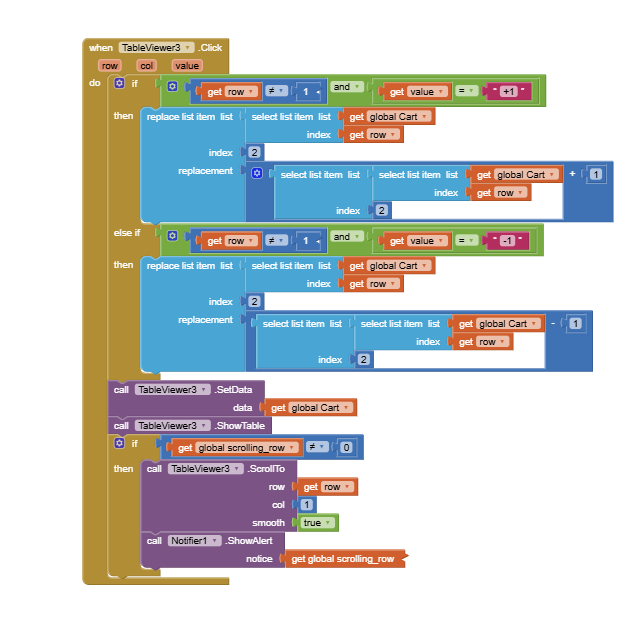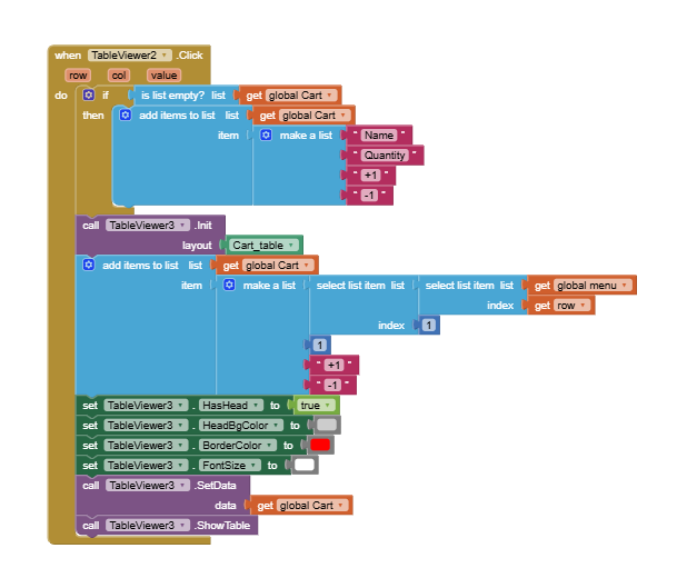 Tableviewer2 is the menu and Table viewer 3 is the cart. When a item is clicked on table 2 it will appear in table 3. In my case i added two column +1 and -1. The can be clicked to change the quantity of the item selected