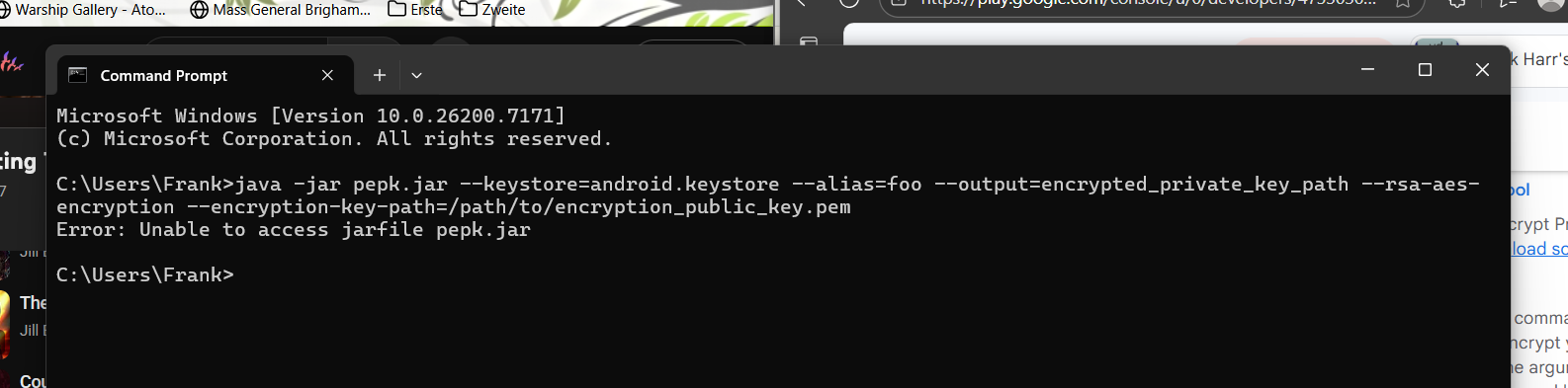 java pepk.jar --keystore=C:\android\repository --alias=keay --output=key.zip --output=key.zip --include-cert --rsa-aes-encription --encryption-key-path=C:\android\repository\encription_public_key.pem and got Error: Unable to access jarfile pepk.jar. Perhaps there are minor transcription errors.