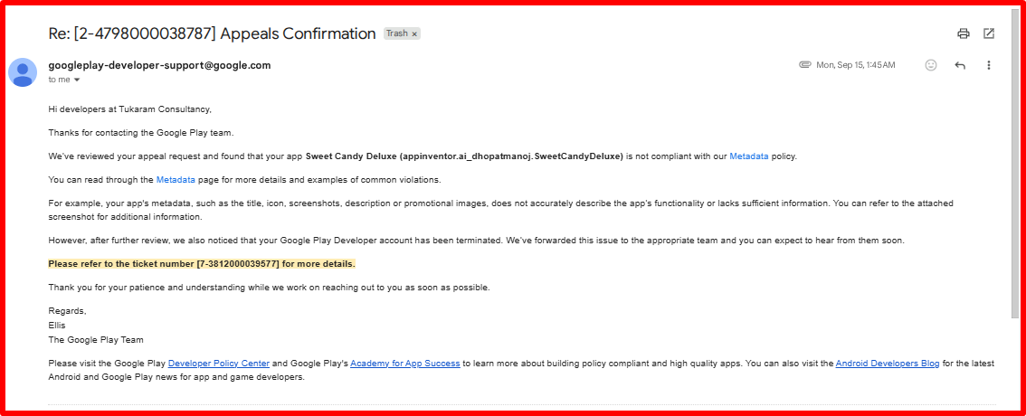 Also Google terminated your developer account. It looks like you have some more serious issue now.