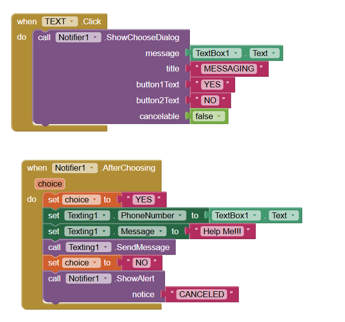 I'm trying to make a code for school where when you click a button it notifies if the action will proceed (which is to text a message to a number). However, I only need 2 buttons, "YES" and "NO." How can I change the outcome of each button without using cancelable since this gives me 3 buttons? I'm not sure what I am doing wrong since I am still new to this.