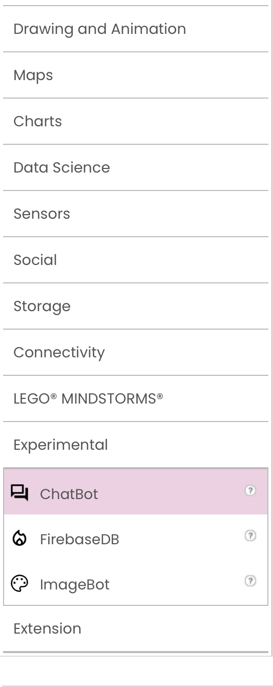 Actually, if you want to make things easier, App Inventor has its own Chatbot component. You can scroll down and expand the Experimental section to see the Chatbot component, or search for it directly in the search bar.