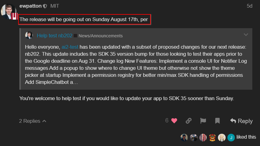 When will the next AppInventor update be available so that our apps can target Android 15?