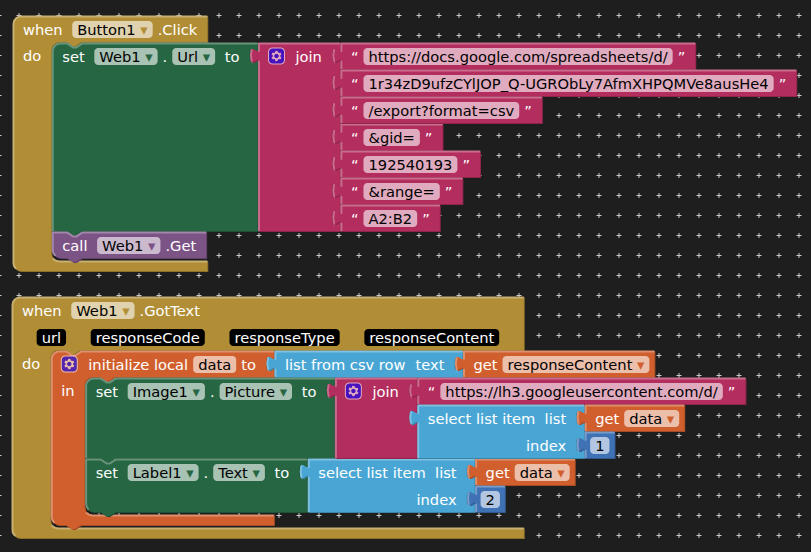 I am trying to make an app to Display Photos from Google drive of which the photo link is on a google sheet and to show also a message whish is on the next shell of the Photo link at google sheet.