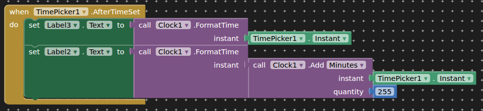 Hi. Newbie here. I am trying to make a project that I can use timepicker to set a start time, and then take a calculated number called TotalMinutes, and add that to the start time, then have it display the end time in HH:MM format. For example, if I put 12:00 PM as the start time, my TotalMinutes is 255, the End Time should be 4:15 PM.