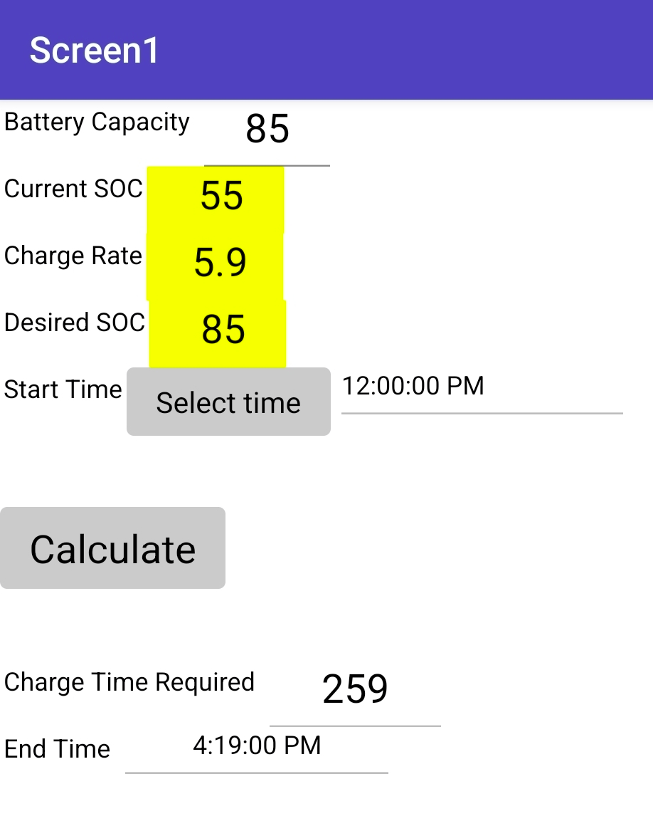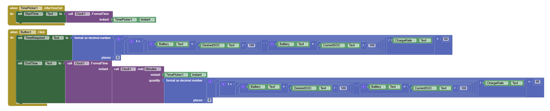 I am working on a simple EV Charge Time calculator that I can use where I enter my battery capacity, current SOC, Desired SOC, and the Charge Rate, which calculates a number in minutes for how long it will take. So, for example, the battery capacity is 85, current SOC is 55%, Desired SOC is 85%, and the charge rate is 6. I have everything set up currently so that when I click Calculate, it displays 255. The problem I am having is converting 255 to a time. Ideally I would like to enter a start time from timepicker, then have it add the 255 minutes to that number, and give me the end time.