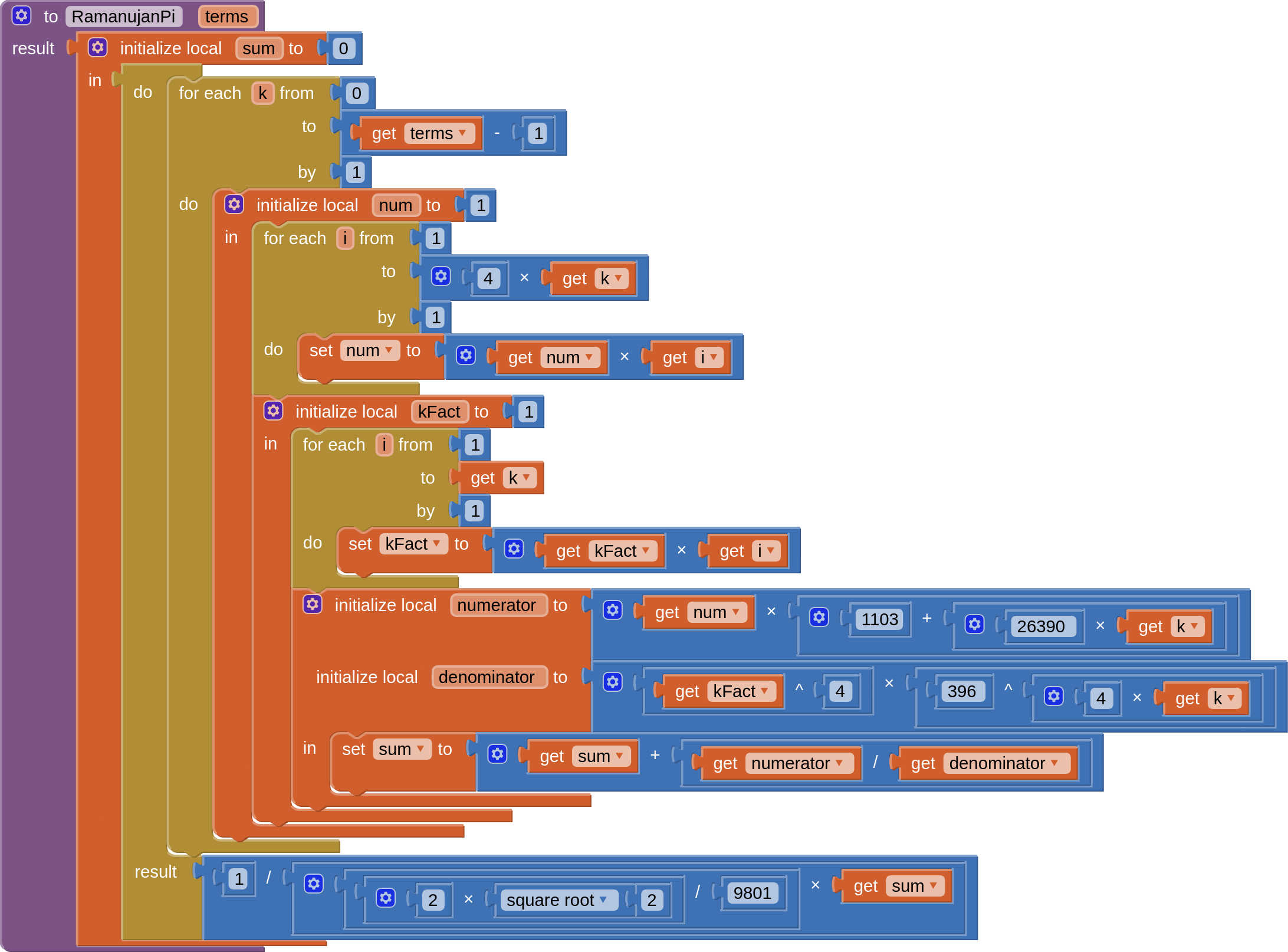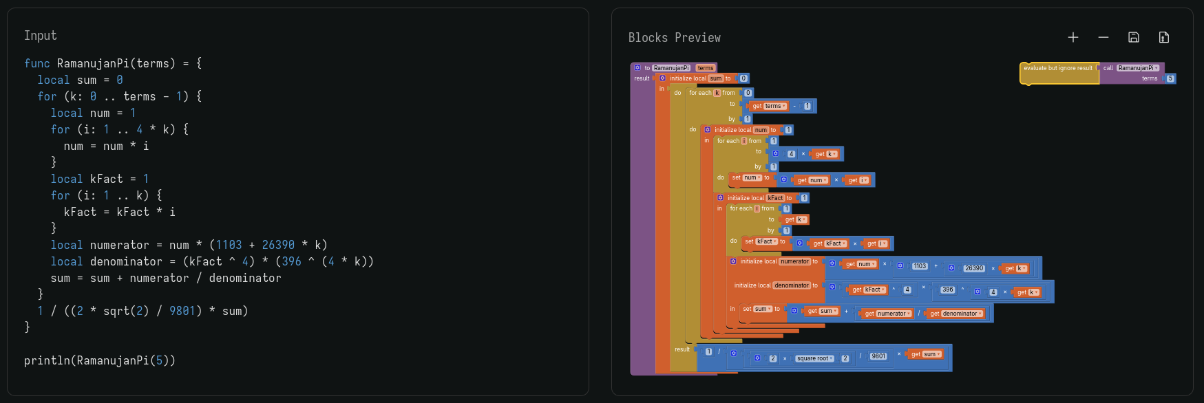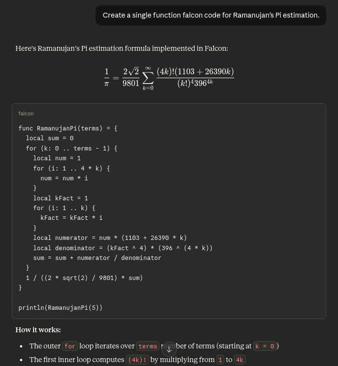 I made this function (Ramanujan's Pi estimation) using AI: