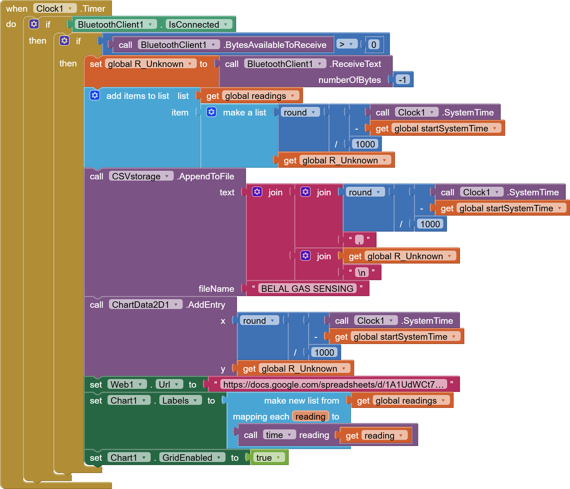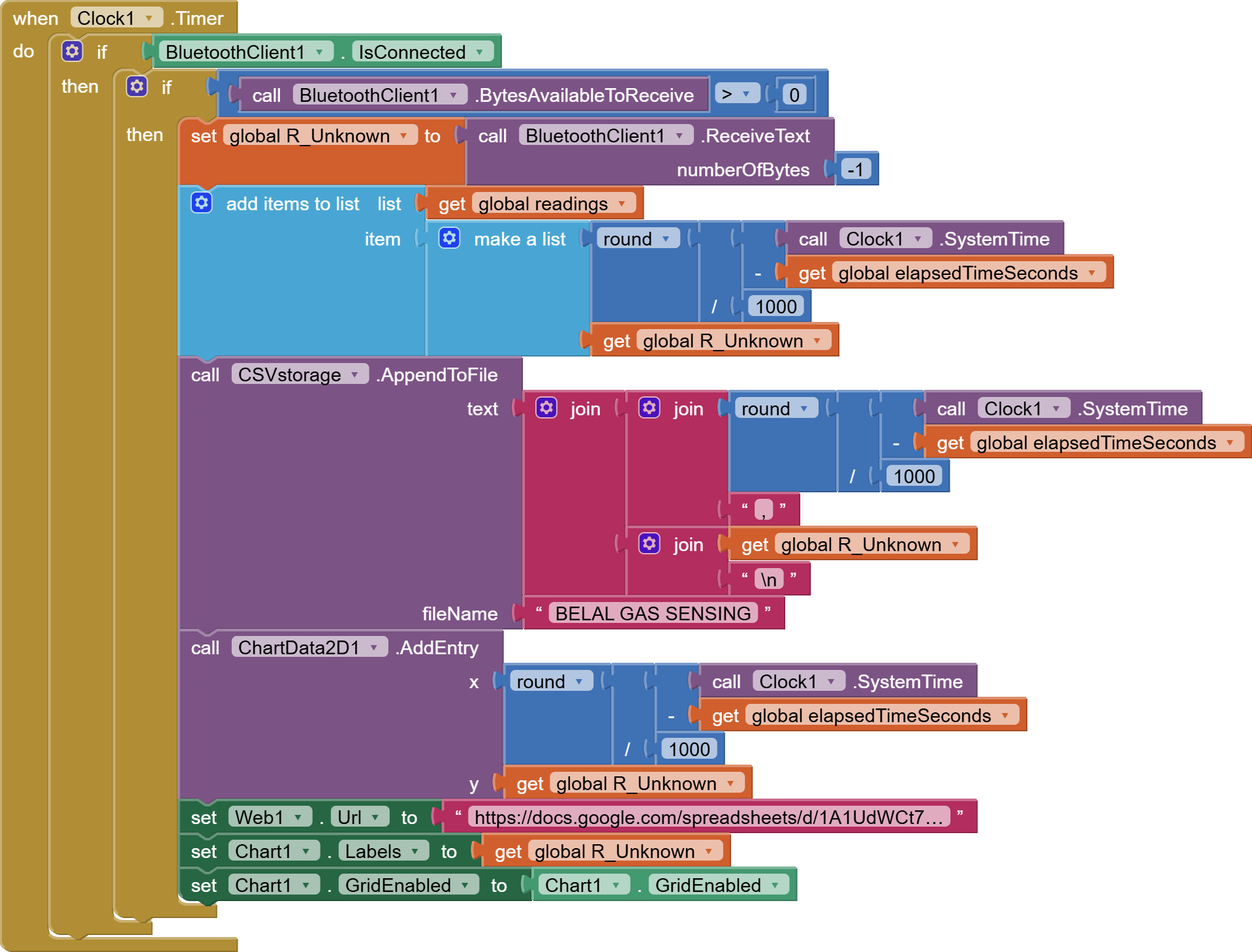 Those seconds are being loaded into item 1 of each (time, R_Unknown) pair in list global readings. That's handy for later, when we need a list of Labels for the Chart.