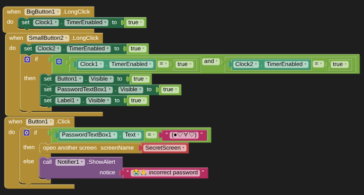 so basically you will need 3 buttons and a password field and 2 clocks for this and it basically works like in "human terms" you hold down one button and you activate another timer and then you hold down another button and then you start a second timer and then with both of the timers being true the password field visible is made "ture" and then also another button (the submit button) is made true but if the wrong password is entered then a "password false" message appears and it doesnt do the command that it was asked to do but anyways ima stop yapping and just show ya'll the code (psa also it was my assignment that im posting just to help anyone out who has a assignment similar to this)