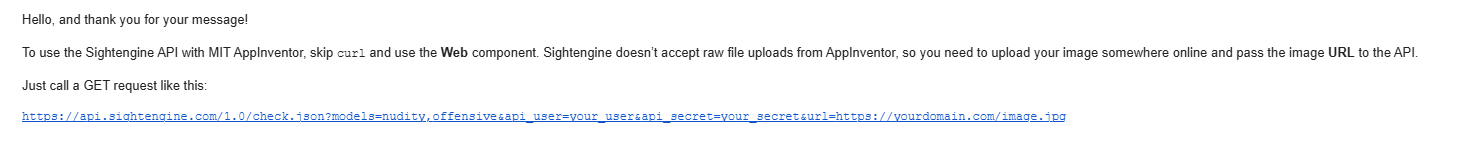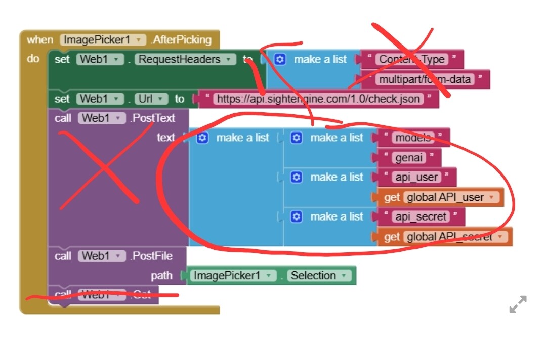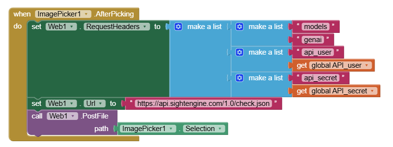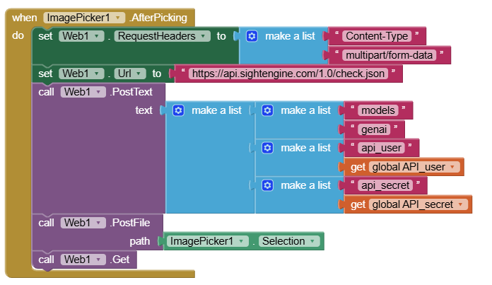 Thank you for your quick response. Unfortunately i don't want to use extensions but only the default appinventor's blocks. I created the following endpoint url https://api.sightengine.com/1.0/check.json&models=genai&api_user=.....&api_secret=.... and the i sent the file path with the Web1.PostFile. Firstly sth I'm doing wrong as i didn't find a way to send both url and file. I didn't use any headers.