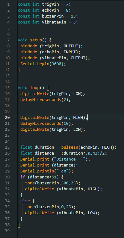 It also has a vibration motor and buzzer physically that beeps and vibrates when the distance is under 61 cm as shown in the code. I would like to keep this feature but if it is not possible I am okay with the app and phone making the sound. Thanks!