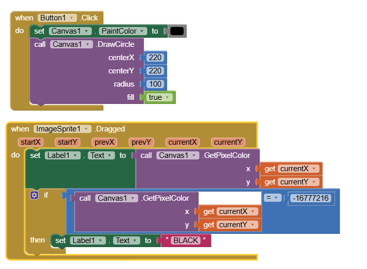 I use the Button1 logic to draw a large Black circle in the Canvas. First press Button1 then When you drag the 50 sprite over the label shows BLACK otherwise the label posts -1 (white).