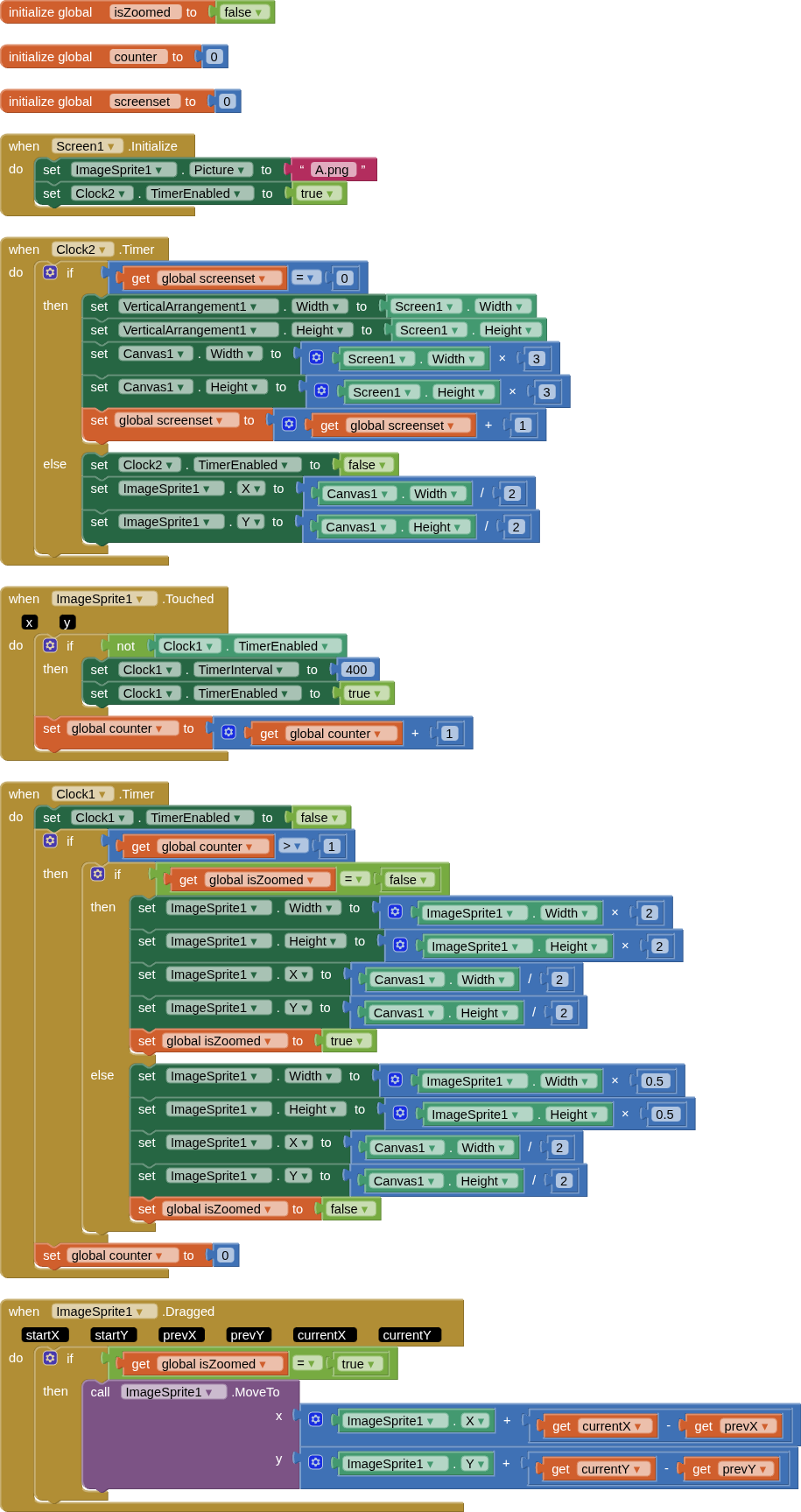 I'm trying to create a simple image viewer where a user can double-tap an ImageSprite to zoom in, and then drag it around with one finger to see different parts of the zoomed image.