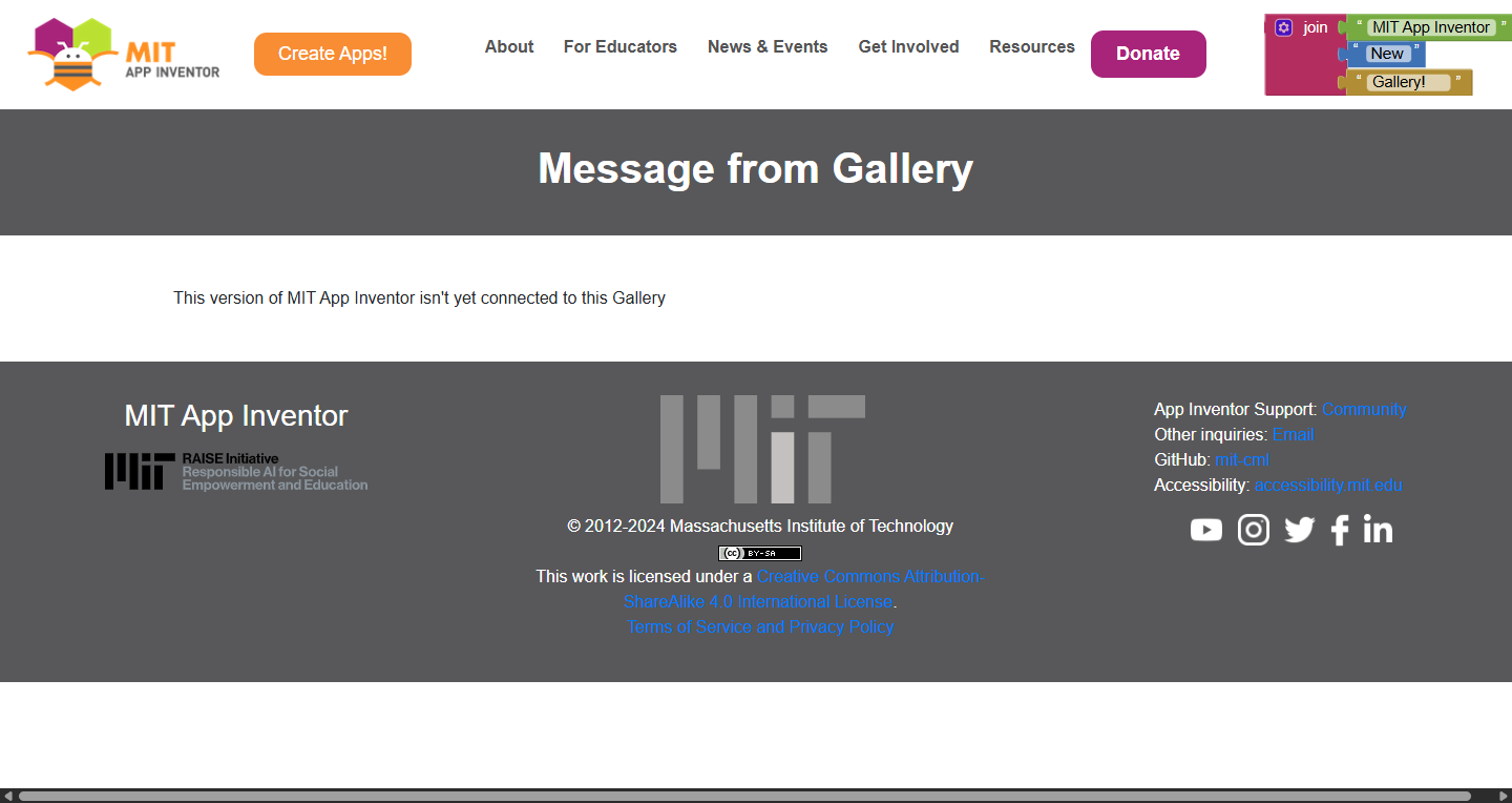 “This version of MIT App Inventor isn’t connected to this Gallery.”