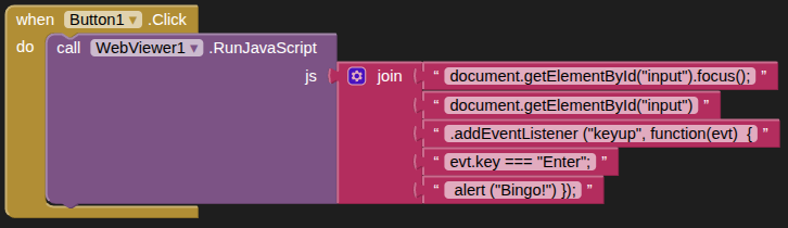 What version of Android are you running? Older versions used a separate web view implementation that may not support features like arrow functions. I will also point out that your code doesn't include an if statement, so it's simply check that evt.key === "Enter", then show the alert. The alert will fire on every key press.