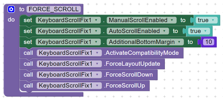 Due to the recent scrolling issues in applications developed with App Inventor versions, including Niotron and Kodular, I have designed an extension that helps solve this problem. The extension is called KeyboardScrollFix and works by forcing the scroll movement either upward or downward.